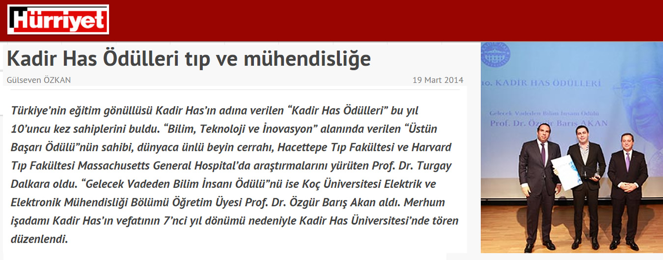 “Kadir Has Awards’ have found their owners. ‘The Promising Scientist Award’ was granted to Prof. Dr. Ozgur B. Akan.” – Hurriyet, 19.03.2014.