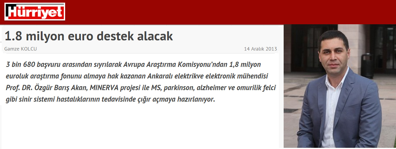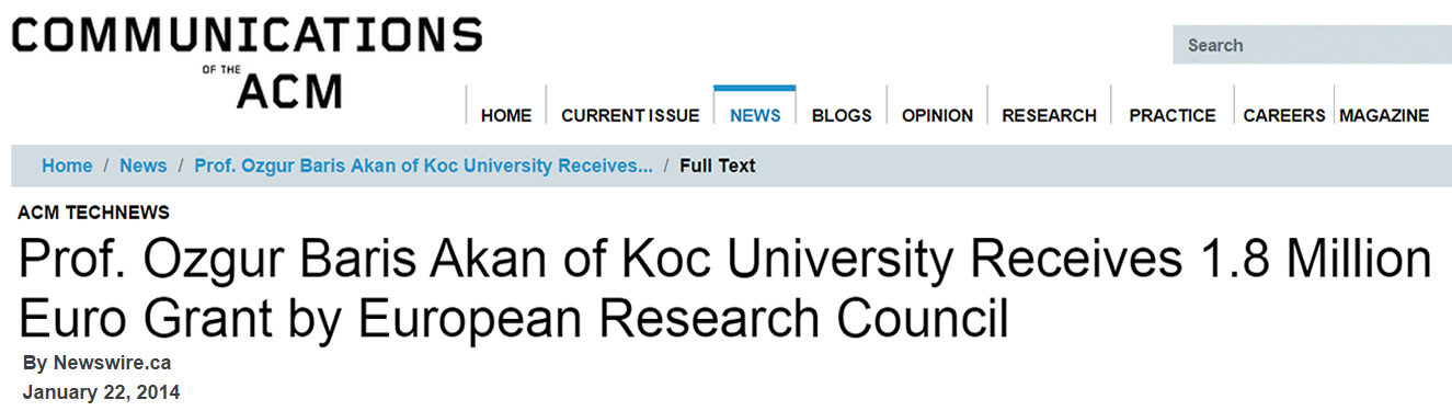 “Prof. Ozgur B. AKAN of Koc University awarded 1.8 million Euro grant by European Research Council (ERC).” – Hürriyet Ankara, 14.12.2013.