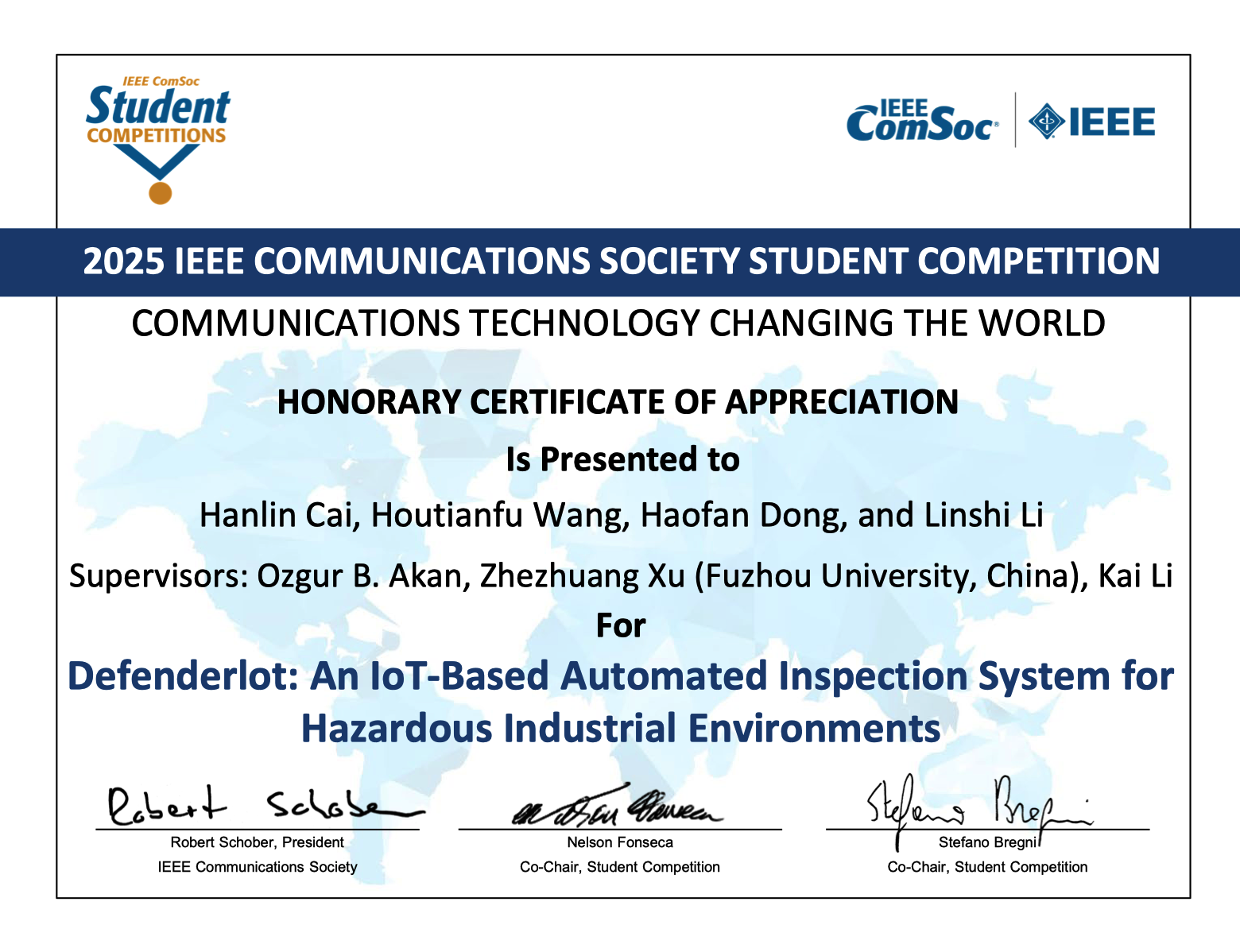 Hanlin, Houtianfu and Haofan received an Honorary Mention Award in the 2025 IEEE ComSoc Student Competition for their project “DefenderIoT: An IoT-Based Automated Inspection System for Hazardous Industrial Environments”, November 2025.